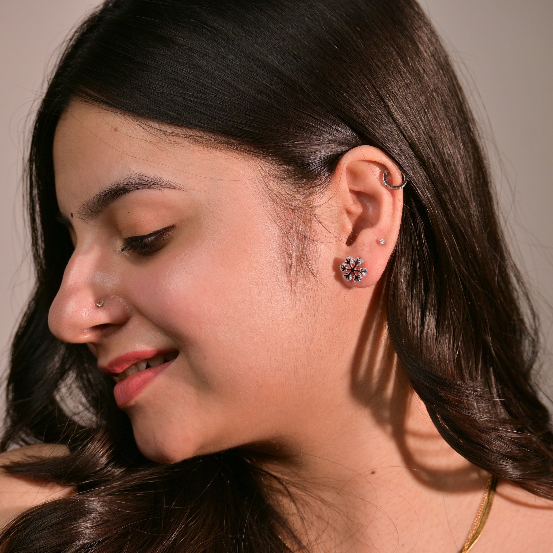 Womily's Paired Periwinkles Design Earrings showcase sterling silver craftsmanship with a charming periwinkle motif. These earrings capture the delicate beauty of periwinkle flowers, adorned with intricate details and subtle elegance. Perfect for adding a touch of floral grace to any ensemble, they are a versatile accessory suitable for both casual and formal occasions.