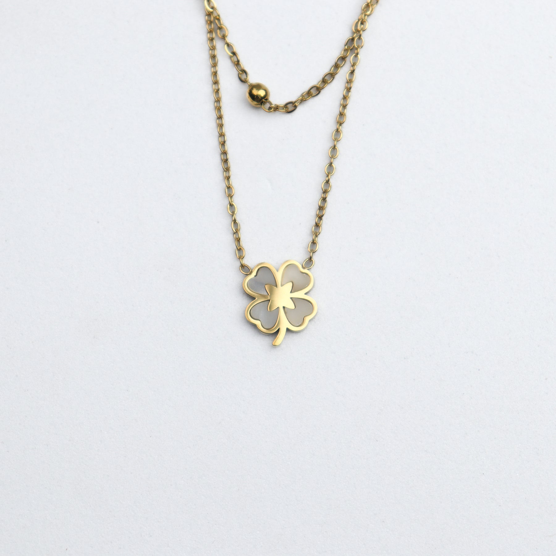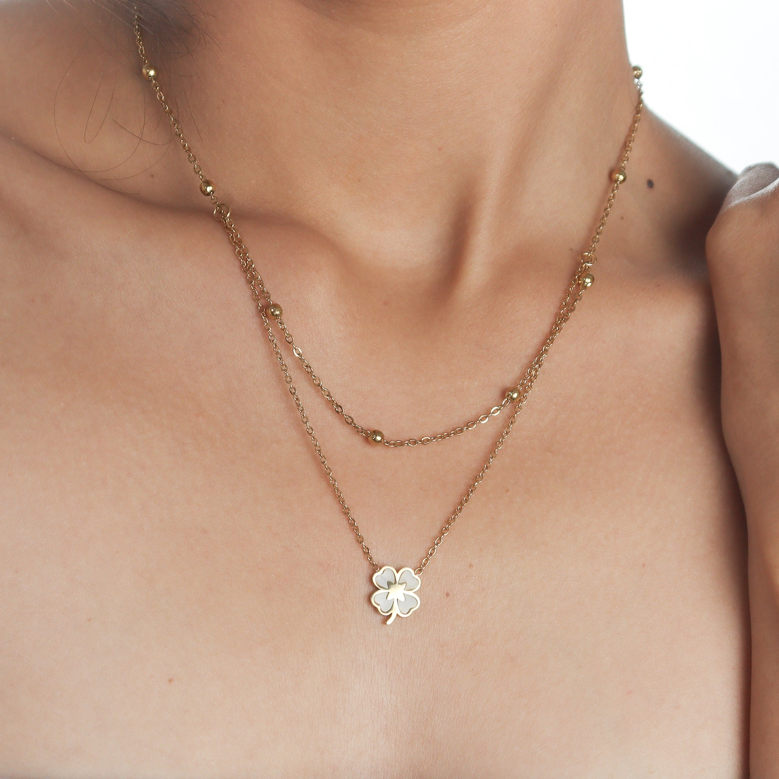 This Dawn Clover Chain brings charm and positivity with its symbolic design. The pendant, finished in anti-tarnish gold, highlights a neatly crafted clover accented with enamel inlays for a subtle shine.