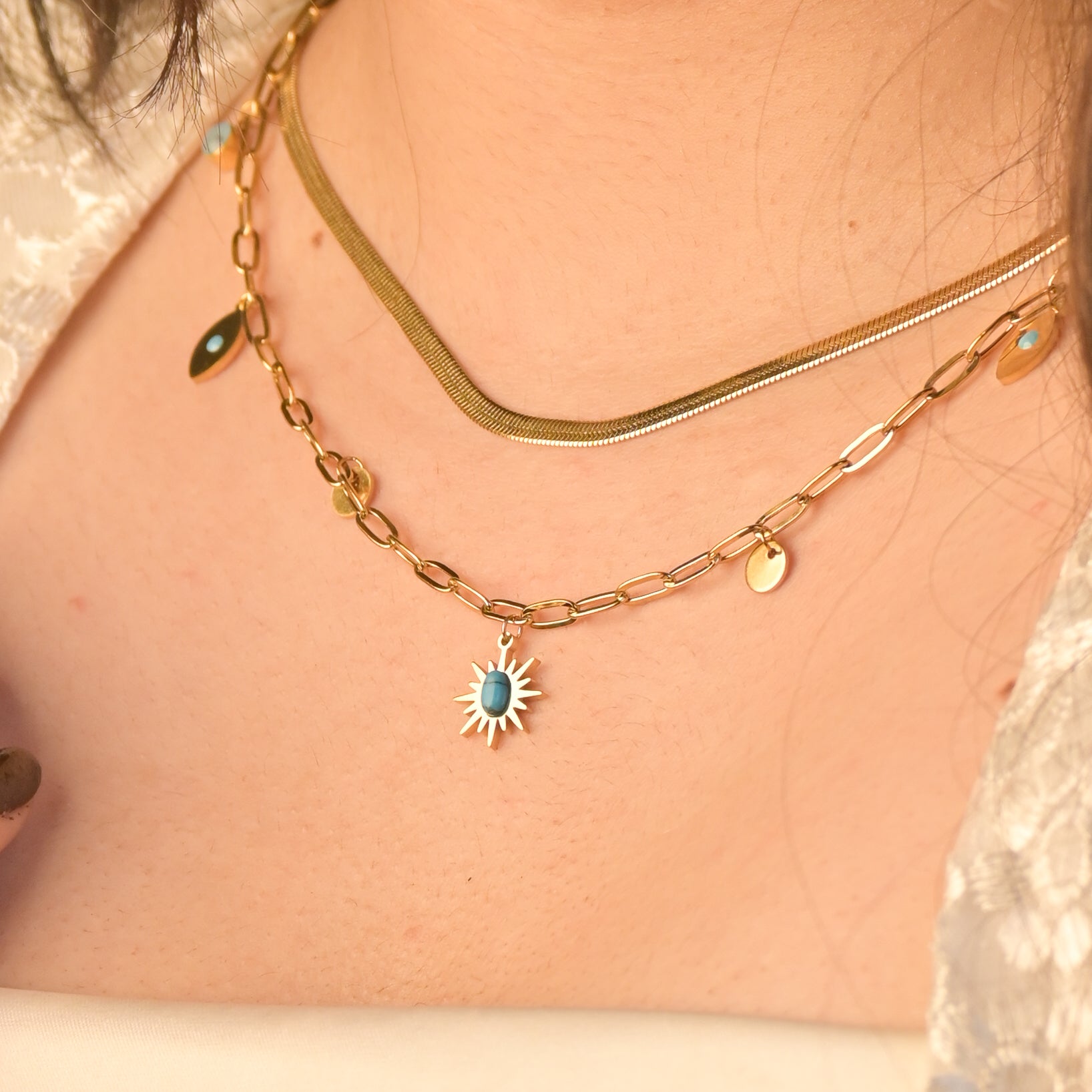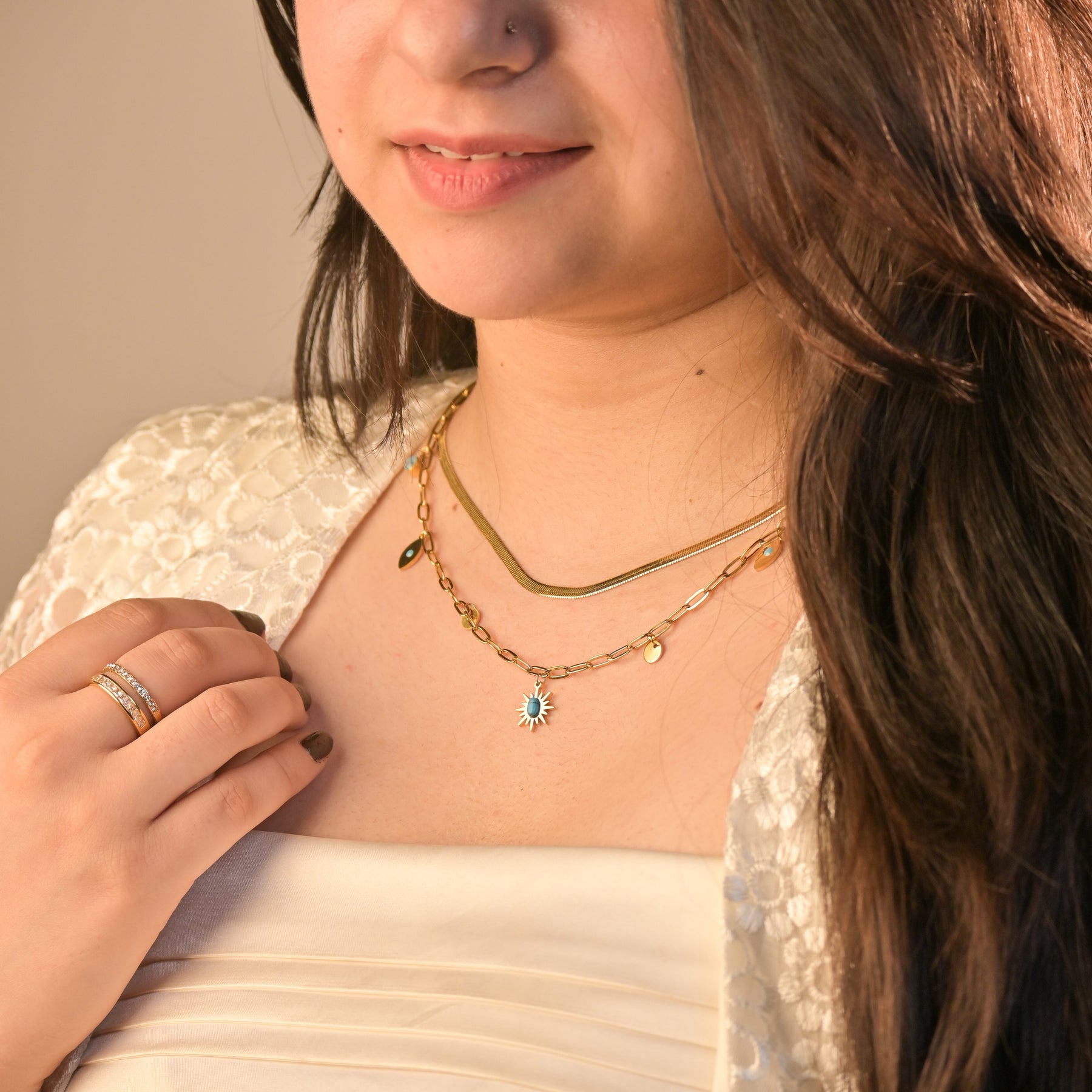 Womily's Dainty Sun Anti-Tarnish Coating Design Chain with Pendant features a delicate sterling silver chain, treated with an anti-tarnish coating for enduring shine. The pendant showcases a beautifully crafted sun motif, embellished with subtle sparkling accents.