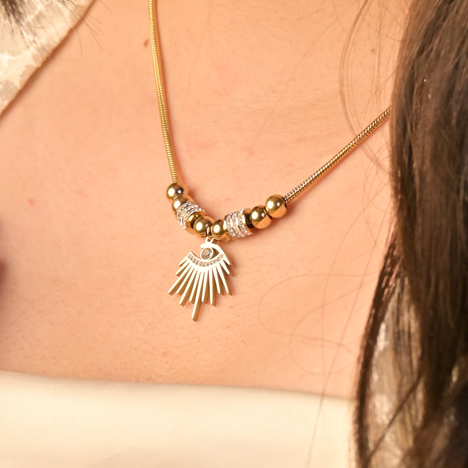 Womily's Sunrise Eye Anti-Tarnish Coating Design Chain With Pendant features a sterling silver chain treated to retain its brilliance over time. The pendant showcases an eye-catching sunrise motif, intricately crafted with shimmering accents or enamel details.