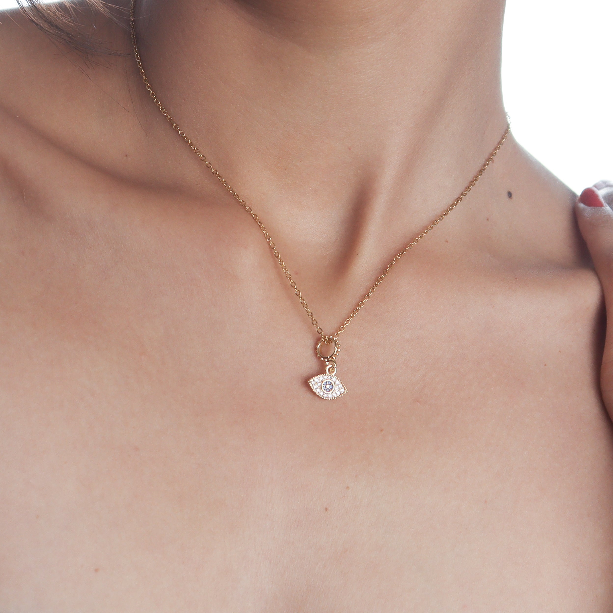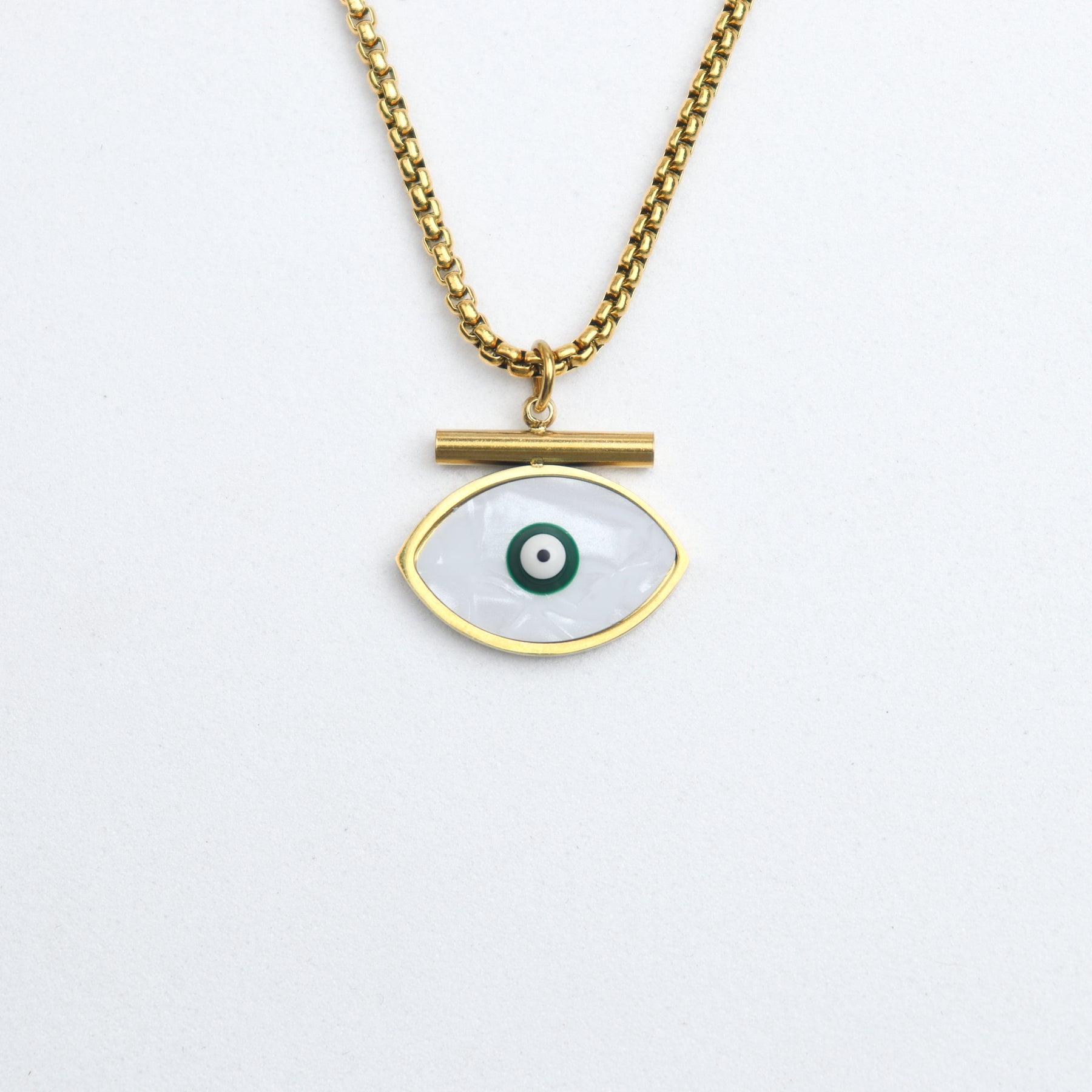 The Evil Eye Protection Necklace showcases a lustrous gold chain with an anti-tarnish finish for long-lasting brilliance. The striking pendant, shaped like an eye, features a pearlescent white base with a vivid green and black center, symbolizing protection and good fortune