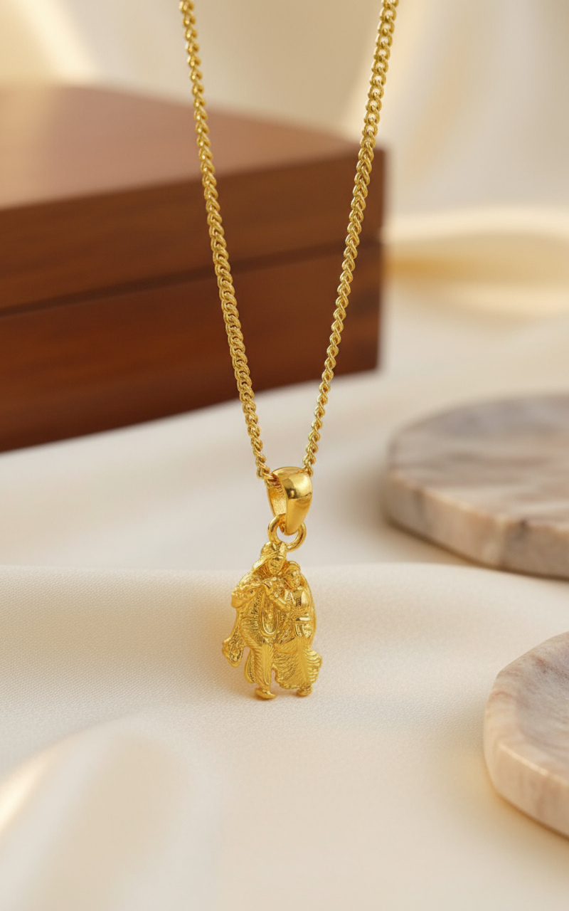 This pendant beautifully captures the divine love and eternal bond of Radha and Krishna, symbolizing purity, devotion, and harmony, making it a graceful piece for girls who wish to wear a touch of soulful elegance close to their heart.